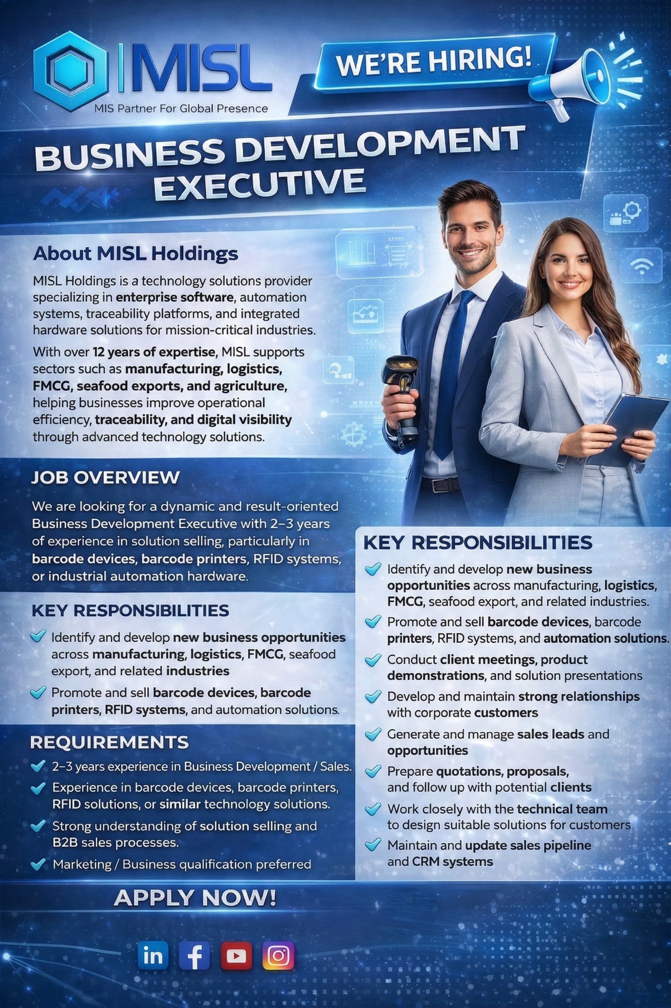 The ideal candidate should be capable of identifying new business opportunities, developing strong customer relationships, and driving sales for MISLβs automation and traceability solutions.
